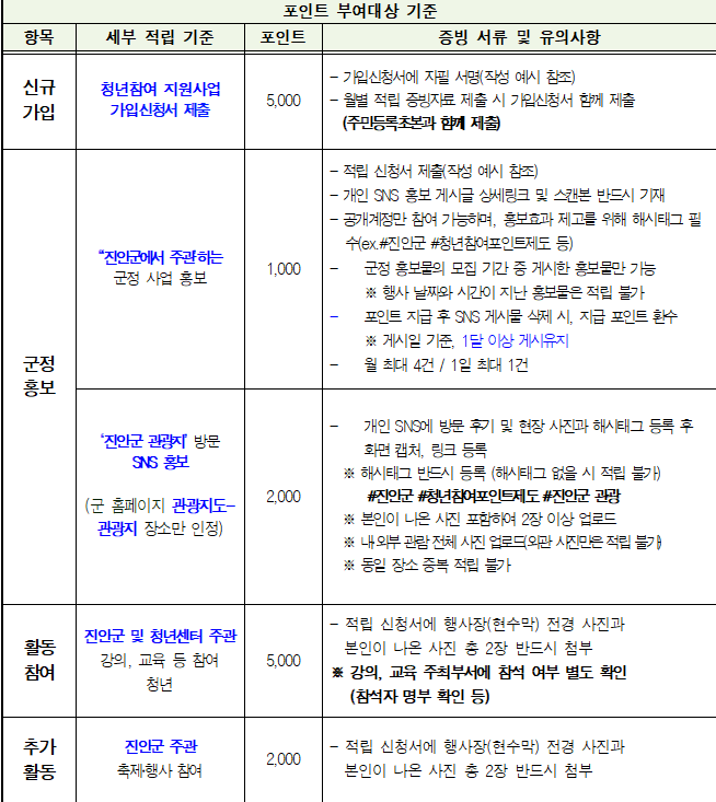 ○ 내 용 : 군정 홍보, 활동 참여, 기타활동의 세가지 분야를 나누어 포인트 적립(별지2호) 및 월 1회(매월 25일 신청-별지3호) 모바일 진안고원 행복상품권으로 교환